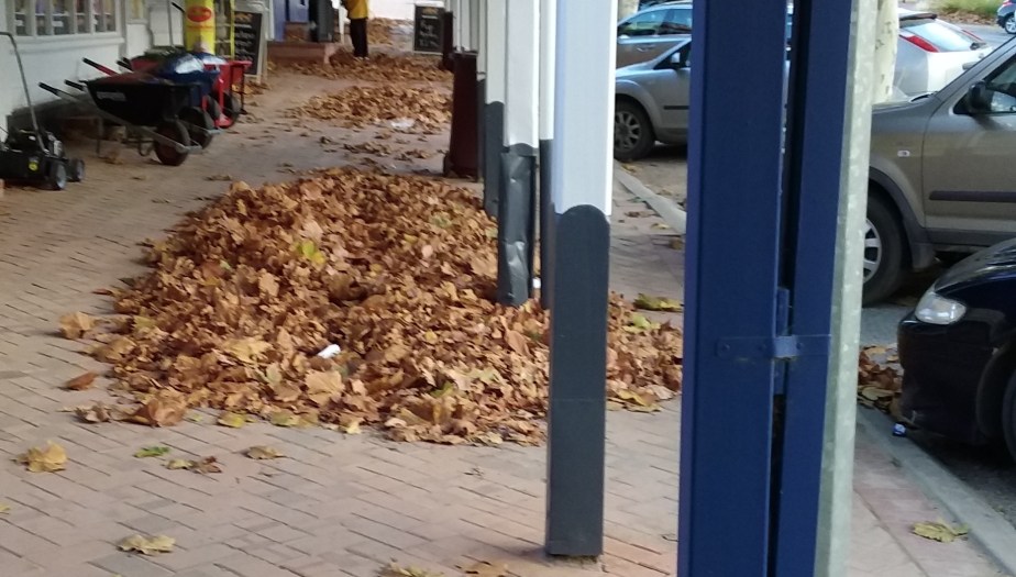 Fallen leaves block the gutters of neighbouring buildings on the street;