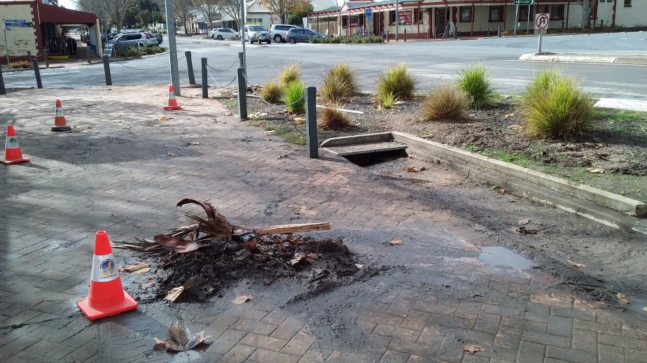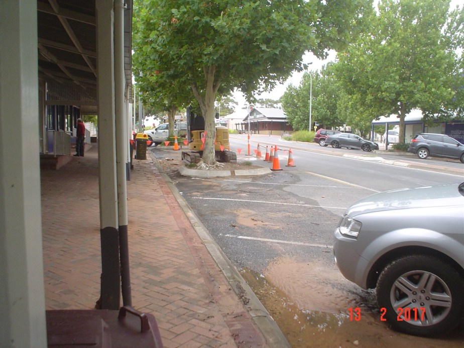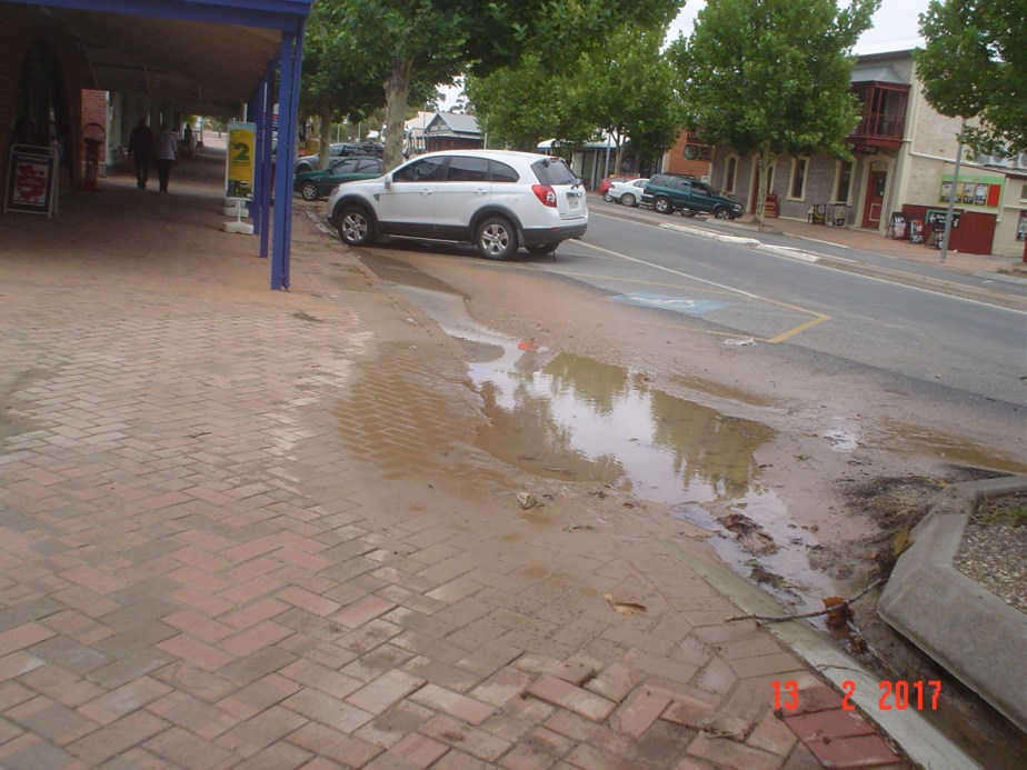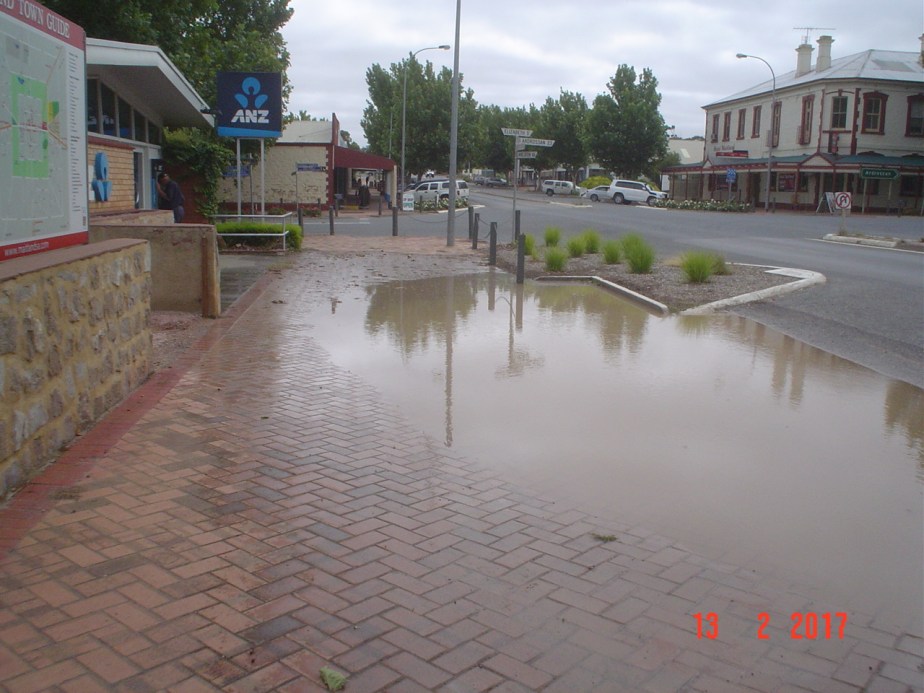 As a result of the tree surrounds obstructing the gutters, water overflowed onto the footpaths in familiar places, such as in front of Foodland, the Newsagents and the Post Office. The water was forced across the median strip by the intensity of flow, to collect in front of the ANZ Bank because the entry to the Elizabeth Street culvert was choked. The water backed up until able to bypass the Bank through its carpark to exit along the side of 30 Elizabeth Street.